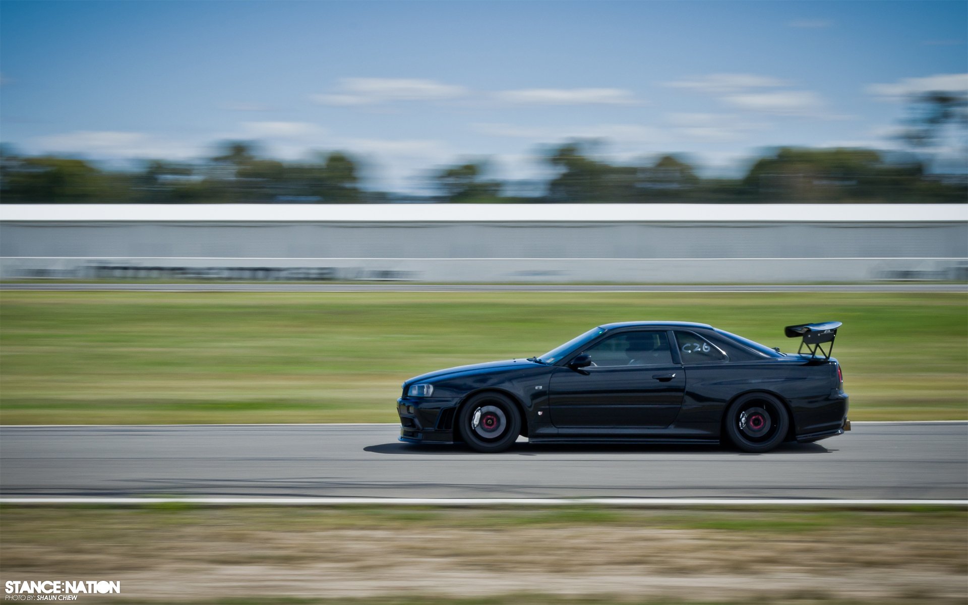 Schwarzer GT-R fährt mit Geschwindigkeit