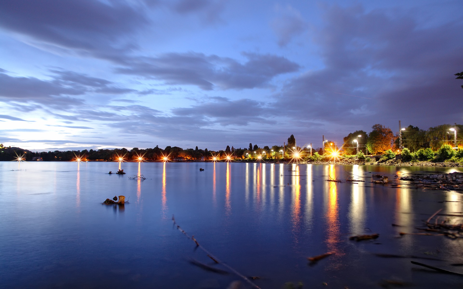Kreuzfahrtschiff am Abend mit Lichtern und Reflexionen auf dem Wasser