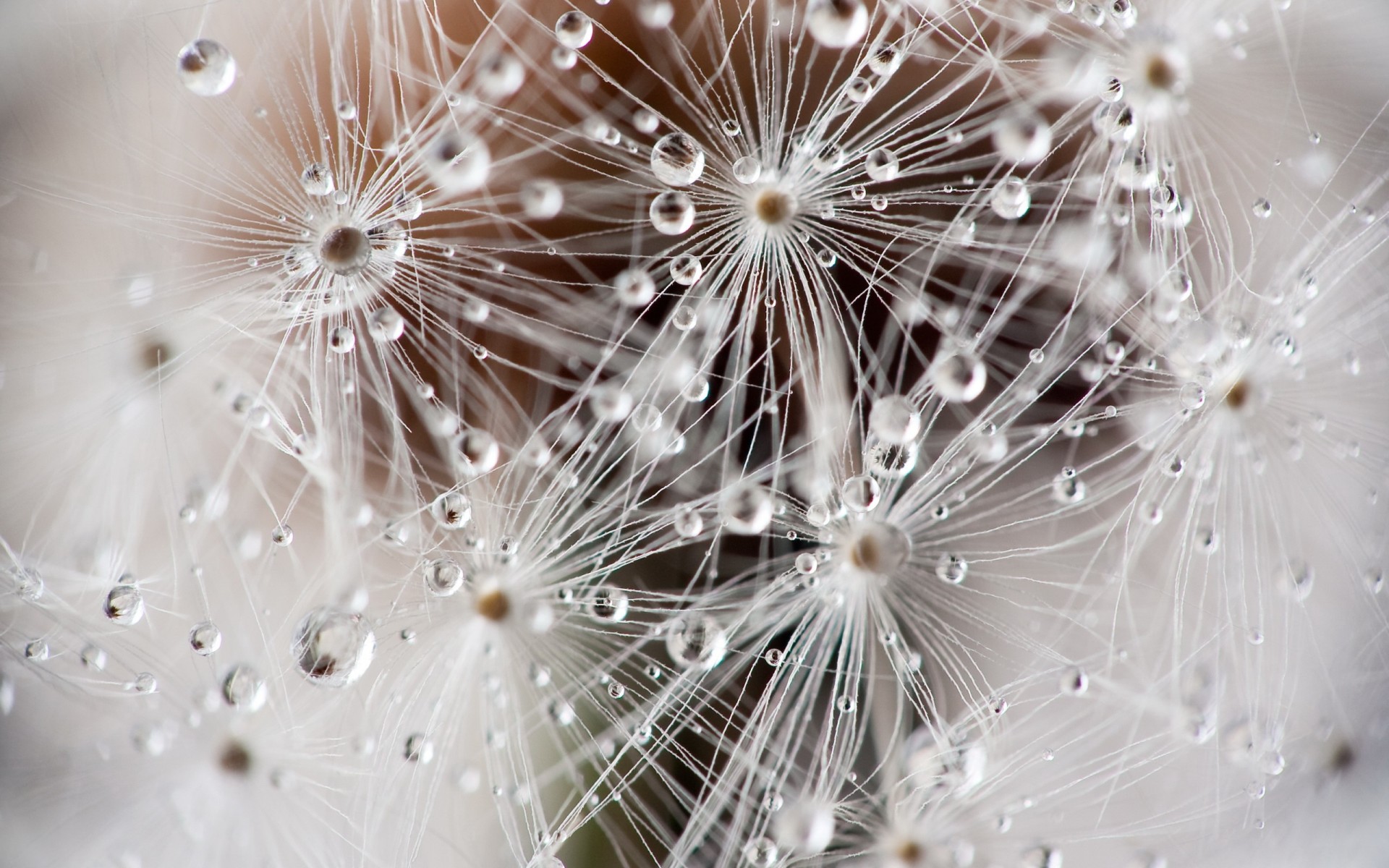 Verschwommenes Foto von Blumen und Tropfen. Ein Tropfen Feeds auf einer Blume