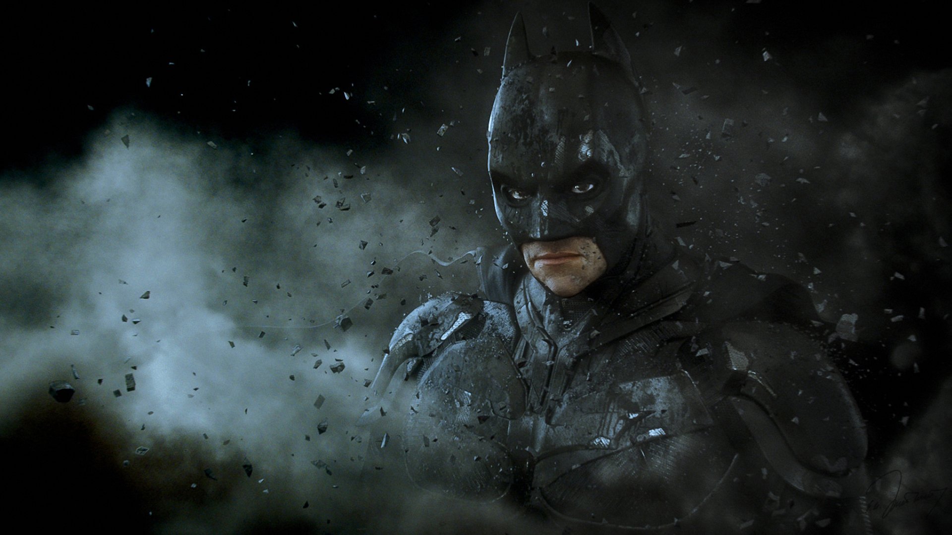 Ein Mann in Batman-Gestalt, umgeben von einem Steinkrümel
