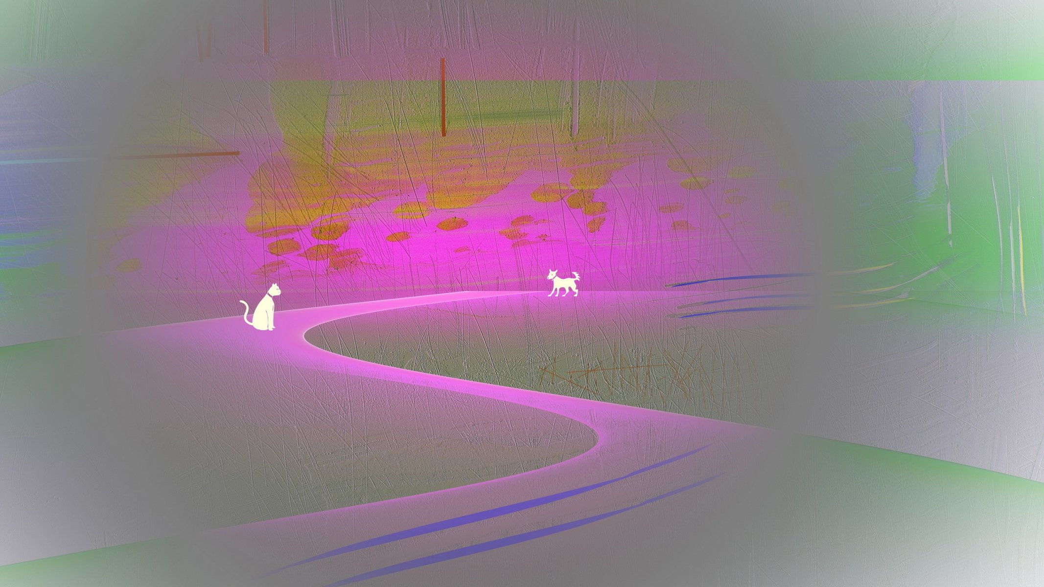Neonkomposition aus einer welligen Straße. Katze und Hund