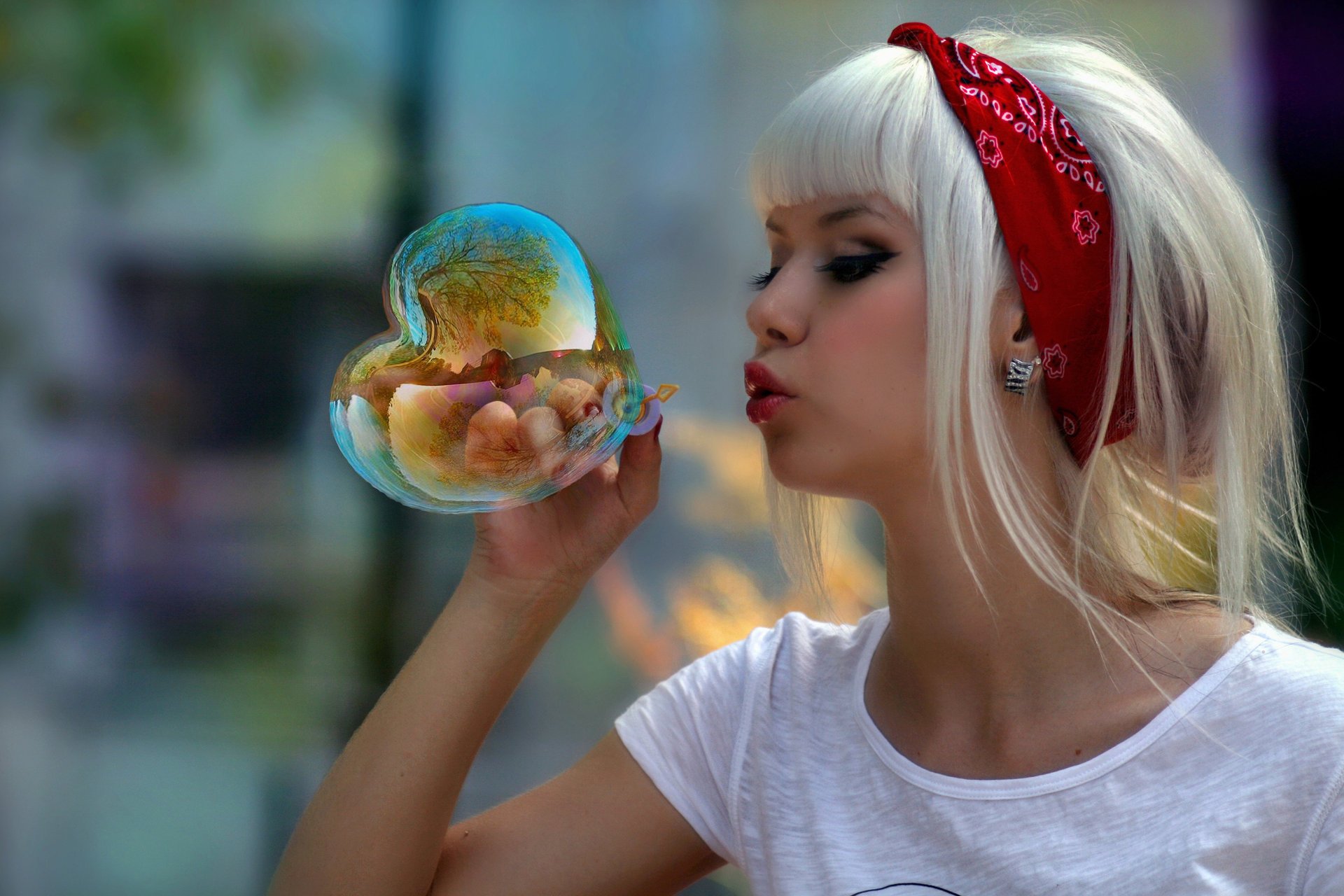 Blondine im weißen t-shirt bläst eine seifenblase aufBlondine im weißen T-Shirt bläst eine Seifenblase auf