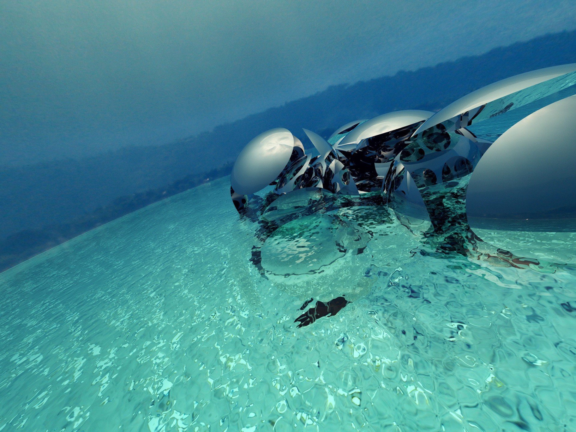 Graue kugeln, die auf der wasseroberfläche schwebenGraue Kugeln, die auf der Wasseroberfläche schweben