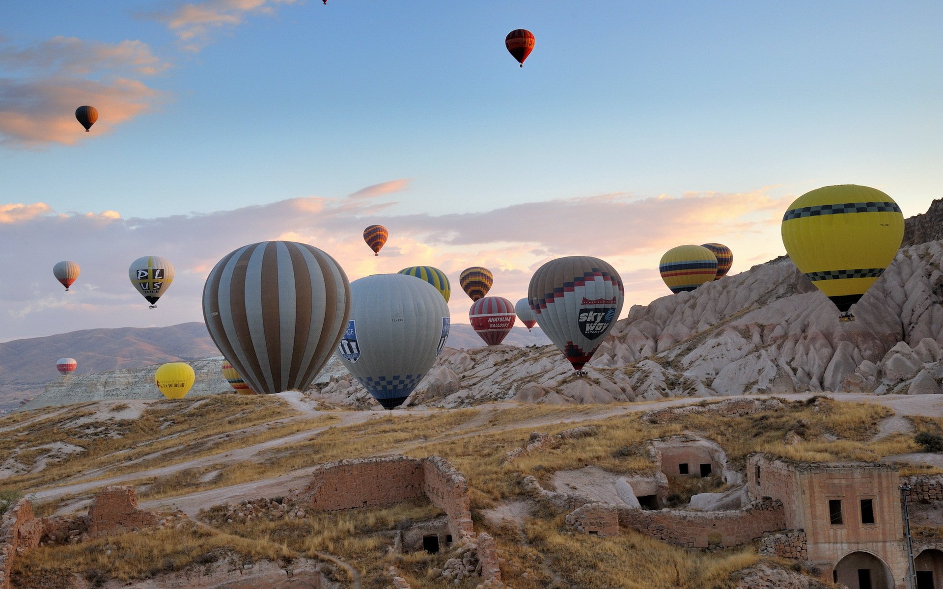 Irgendwo in den bergen gibt es einen blauen himmel, der mit luftballons übersät istIrgendwo in den Bergen gibt es einen blauen Himmel, der mit Luftballons übersät ist