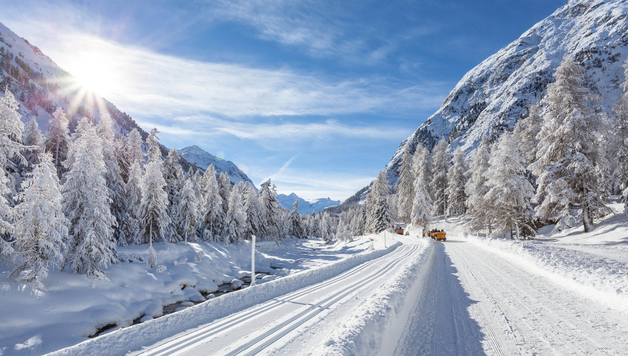 Ein schneesturm, durch den verschneite bäume sichtbar sindEin Schneesturm, durch den verschneite Bäume sichtbar sind