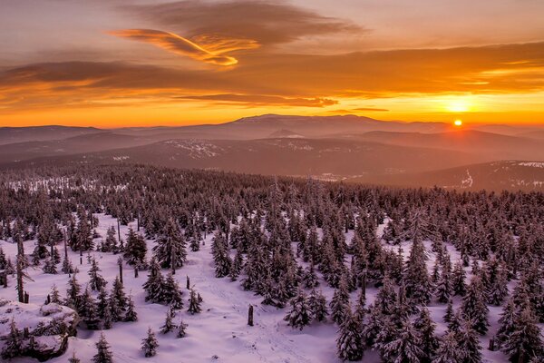 Sonnenuntergang in den Bergen über endlosen Wolken