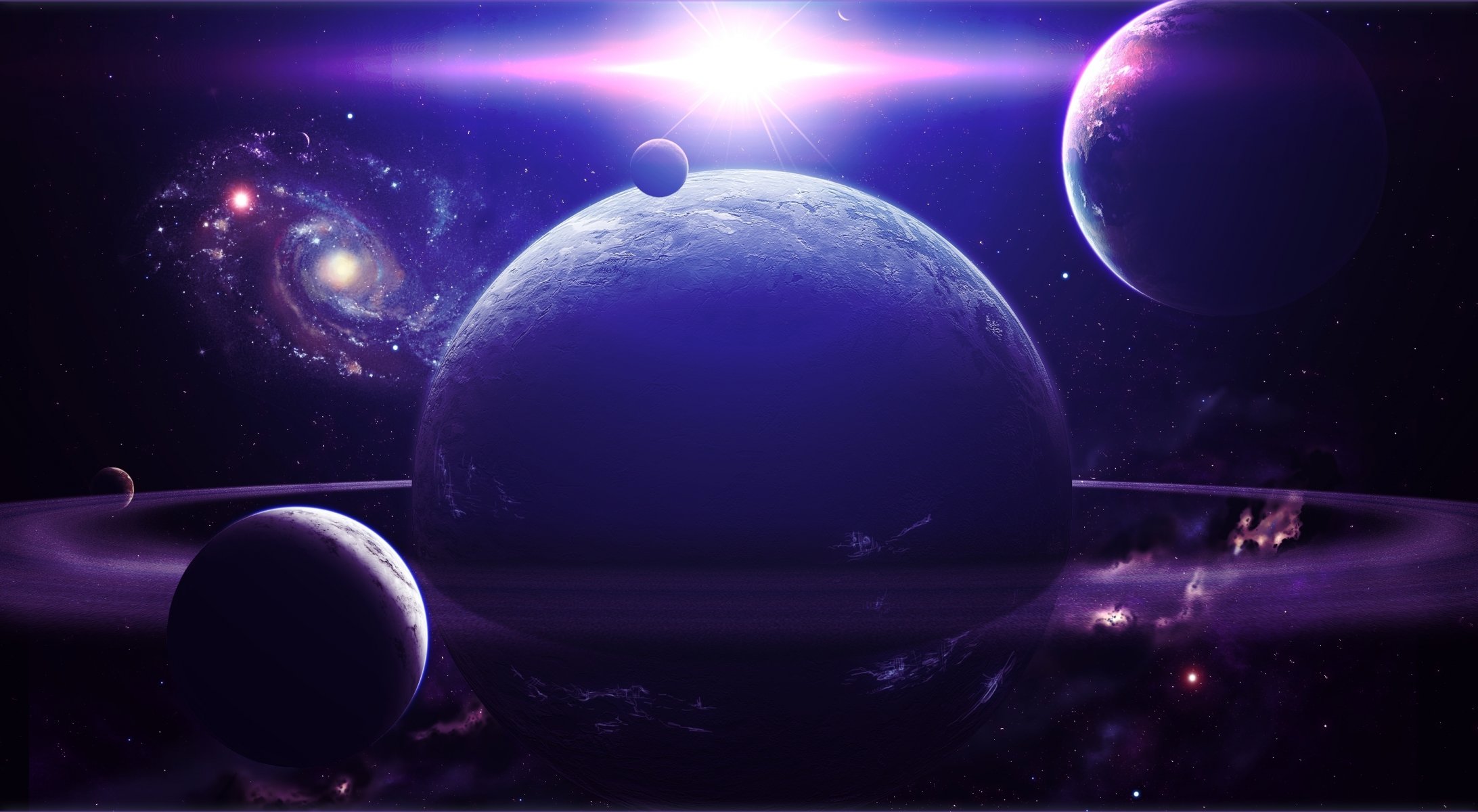 Ein grauer Planet im Lichtnebel von rosa Blau und lila Blüten