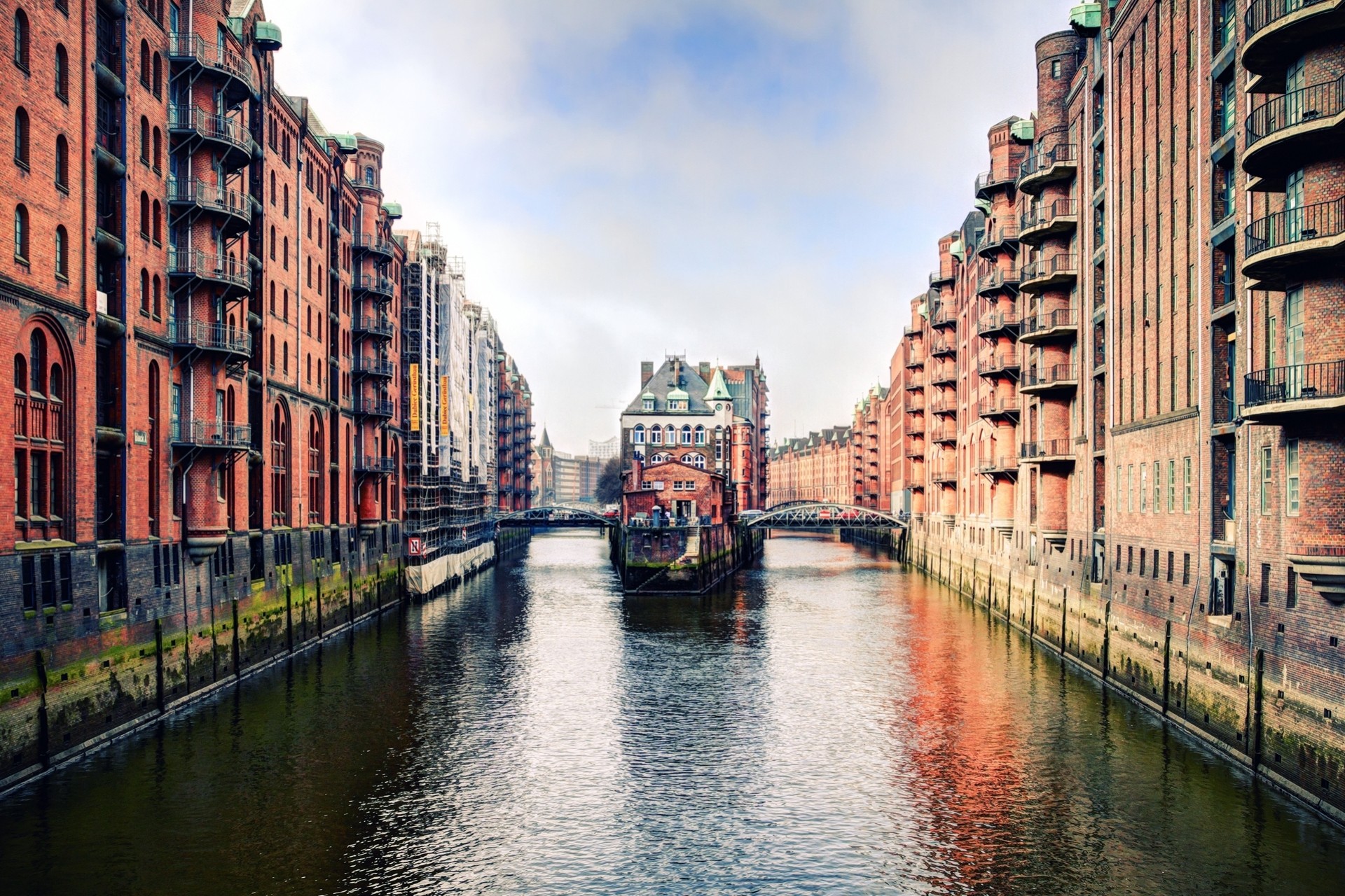 Straße mit häusern in deutschland in der nähe des kanalsStraße mit Häusern in Deutschland in der Nähe des Kanals