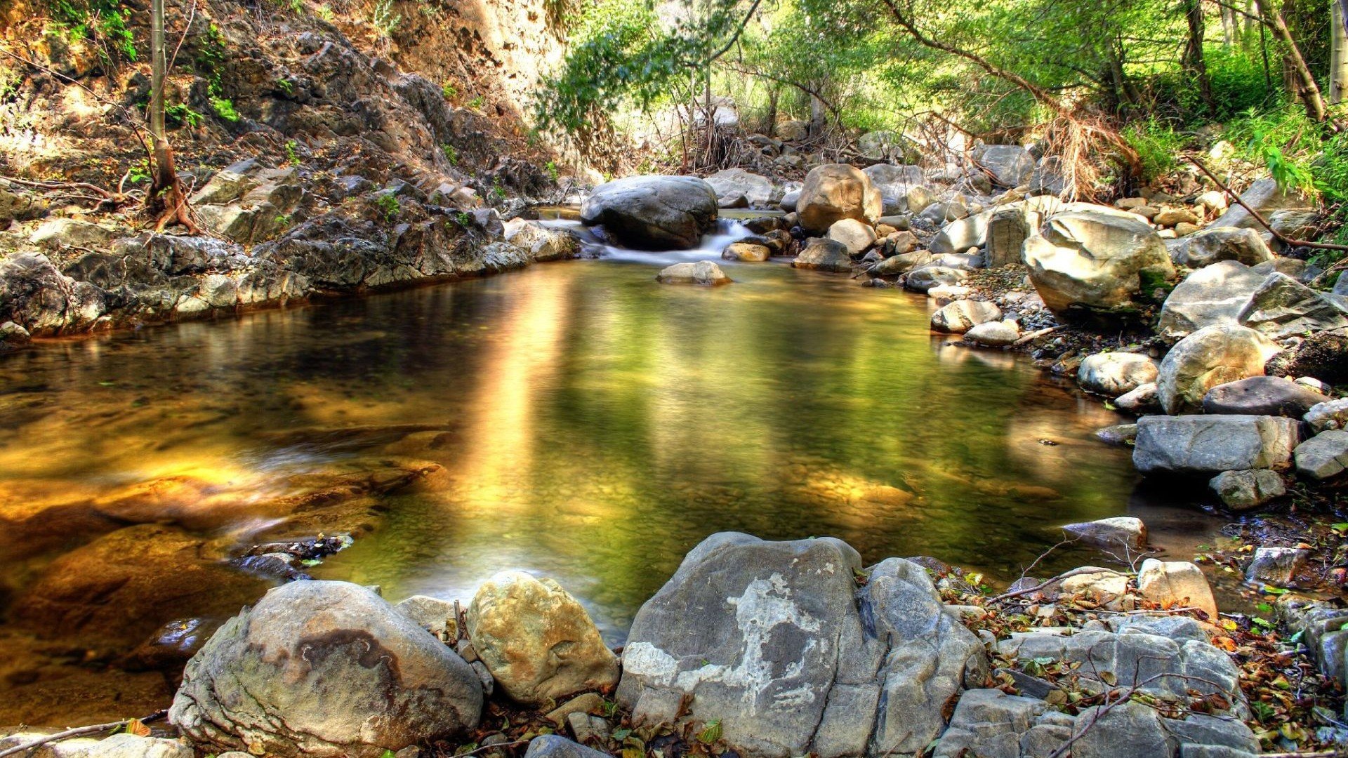 Ein Waldbach und die Sonne bei Sonnenuntergang