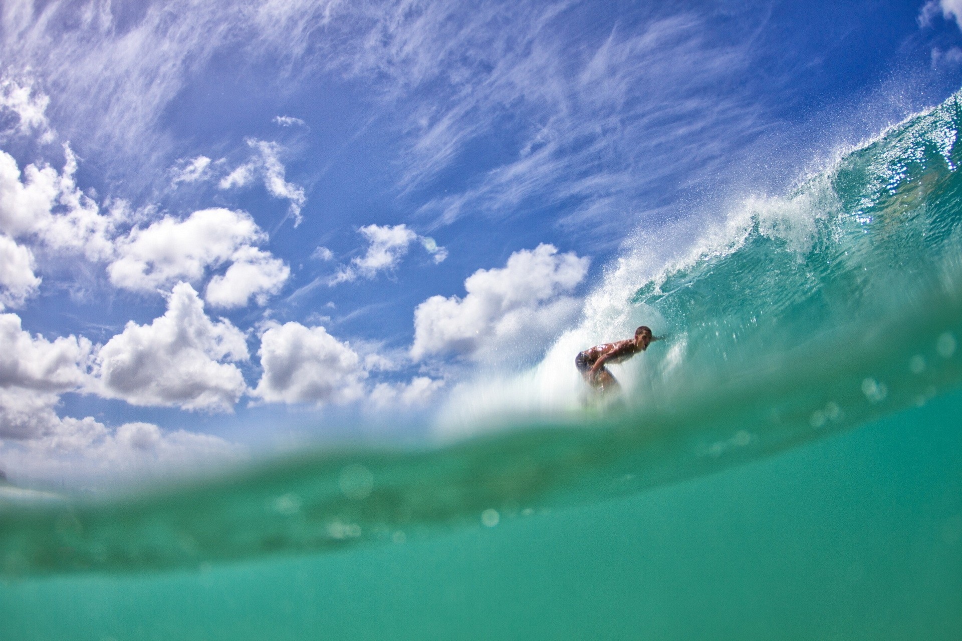 Surfer auf einem Wellenkamm zwischen Himmel und Wasser