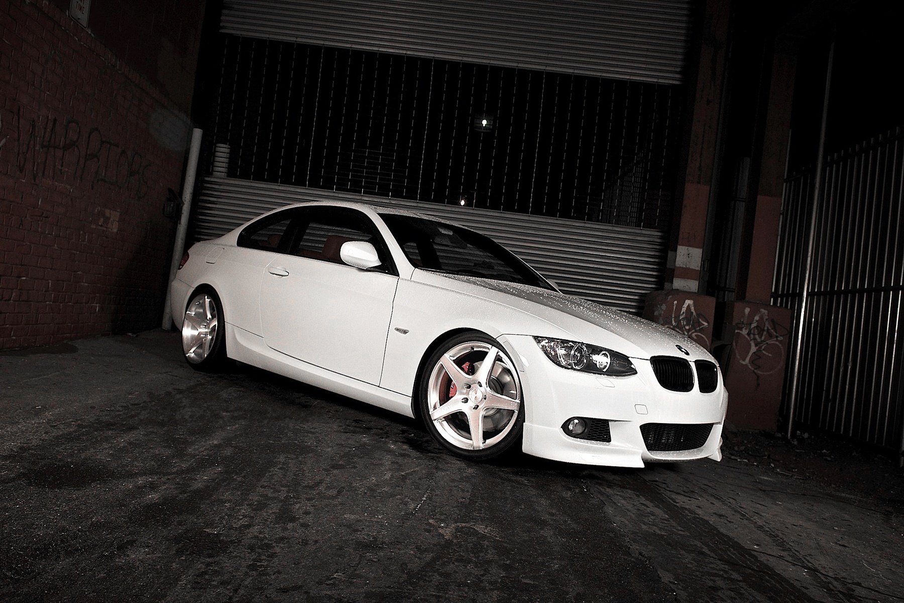 Ein schneeweißer BMW ist romantisch mit Wassertropfen auf der Motorhaube