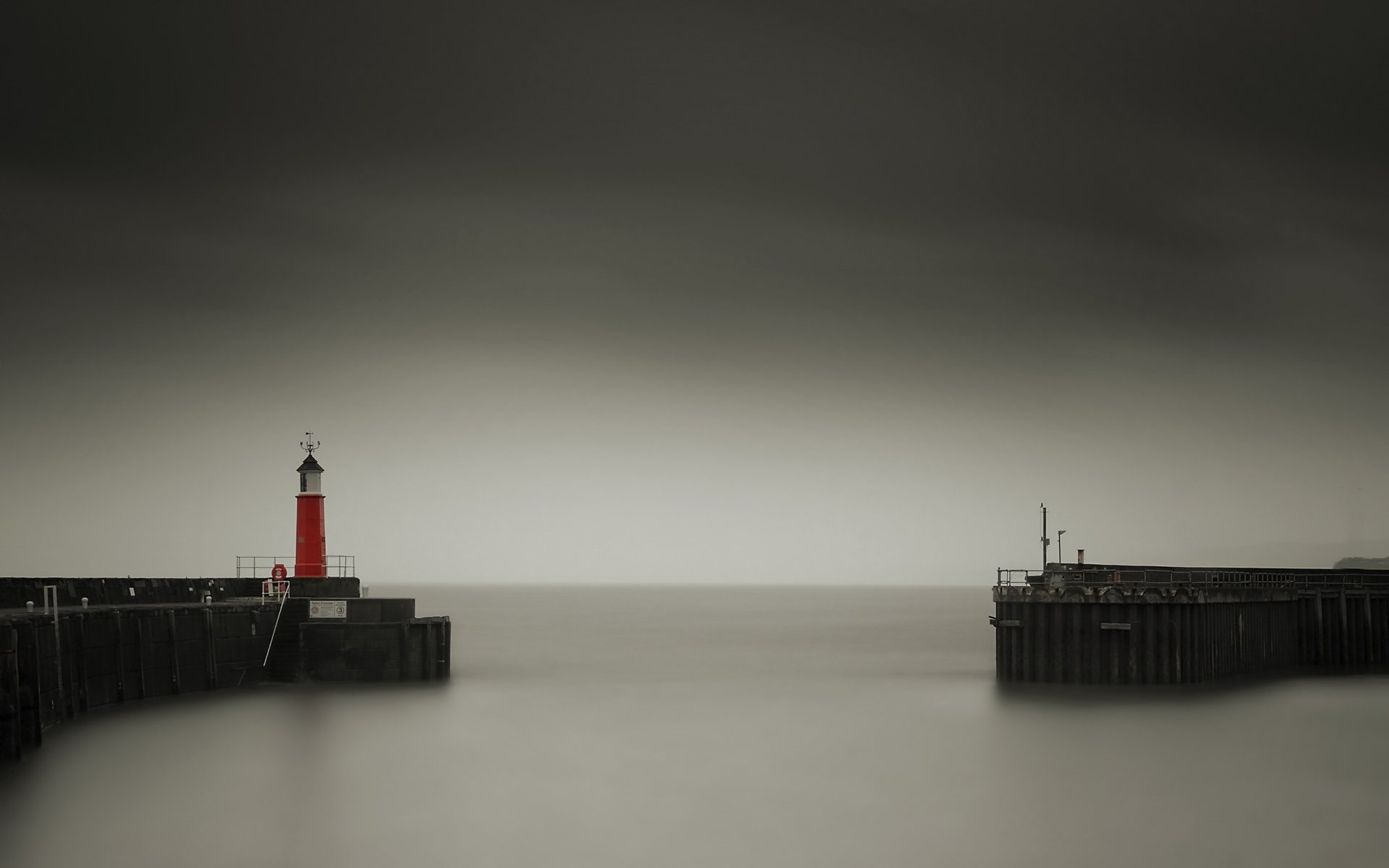 Roter Leuchtturm am Ufer des ruhigen Meeres