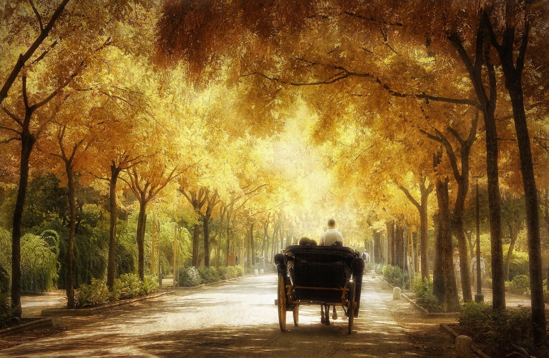 Die beiden gehen im Abenddämmerung im Wald durch den Park