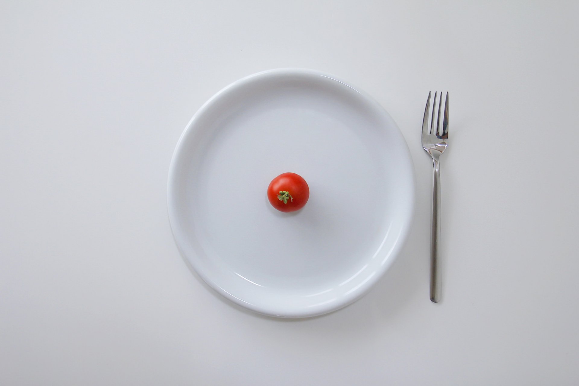 Weißer teller mit kirschtomate und gabel auf weißem tischWeißer Teller mit Kirschtomate und Gabel auf weißem Tisch