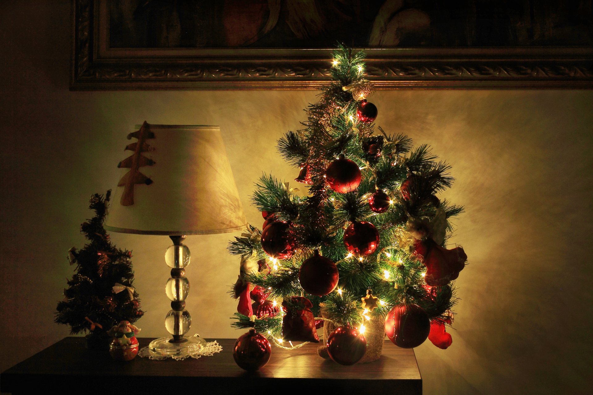 Weihnachtsbaum in Lichtern im Zimmer auf dem Nachttisch
