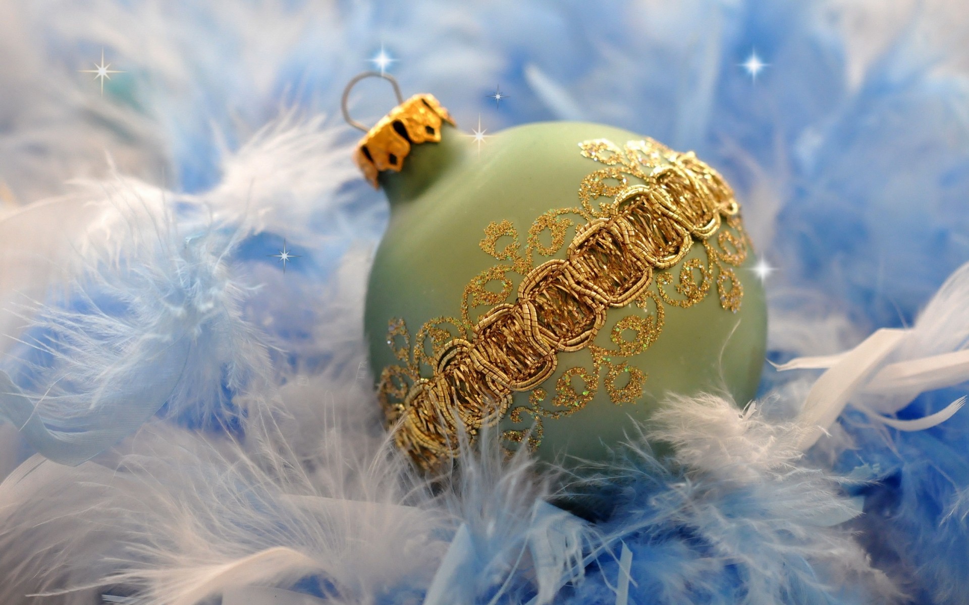 Weihnachtskugel mit goldenen mustern auf weißen und blauen federnWeihnachtskugel mit goldenen Mustern auf weißen und blauen Federn