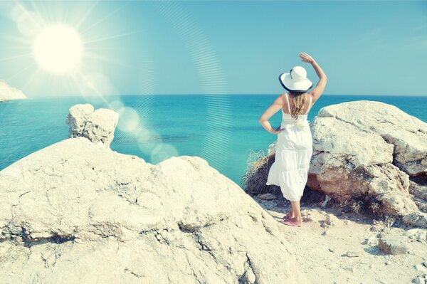 Mädchen in einem schönen kleid auf einem stein in der nähe des meeresMädchen in einem schönen Kleid auf einem Stein in der Nähe des Meeres