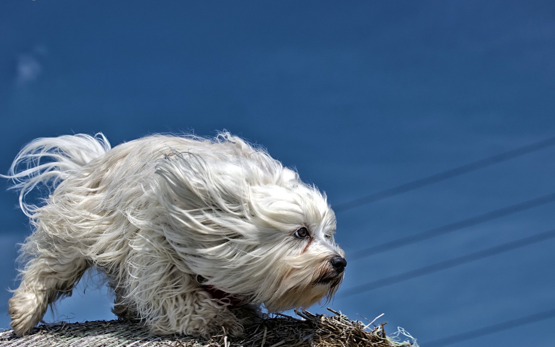 Großer weißer zottiger Hund, der in die Ferne schaut