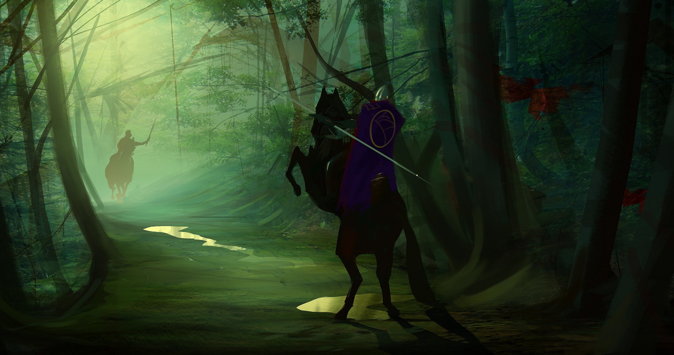 Mädchen mit einem roten zopf, umgeben von lustigen kreaturen im waldMädchen mit einem roten Zopf, umgeben von lustigen Kreaturen im Wald