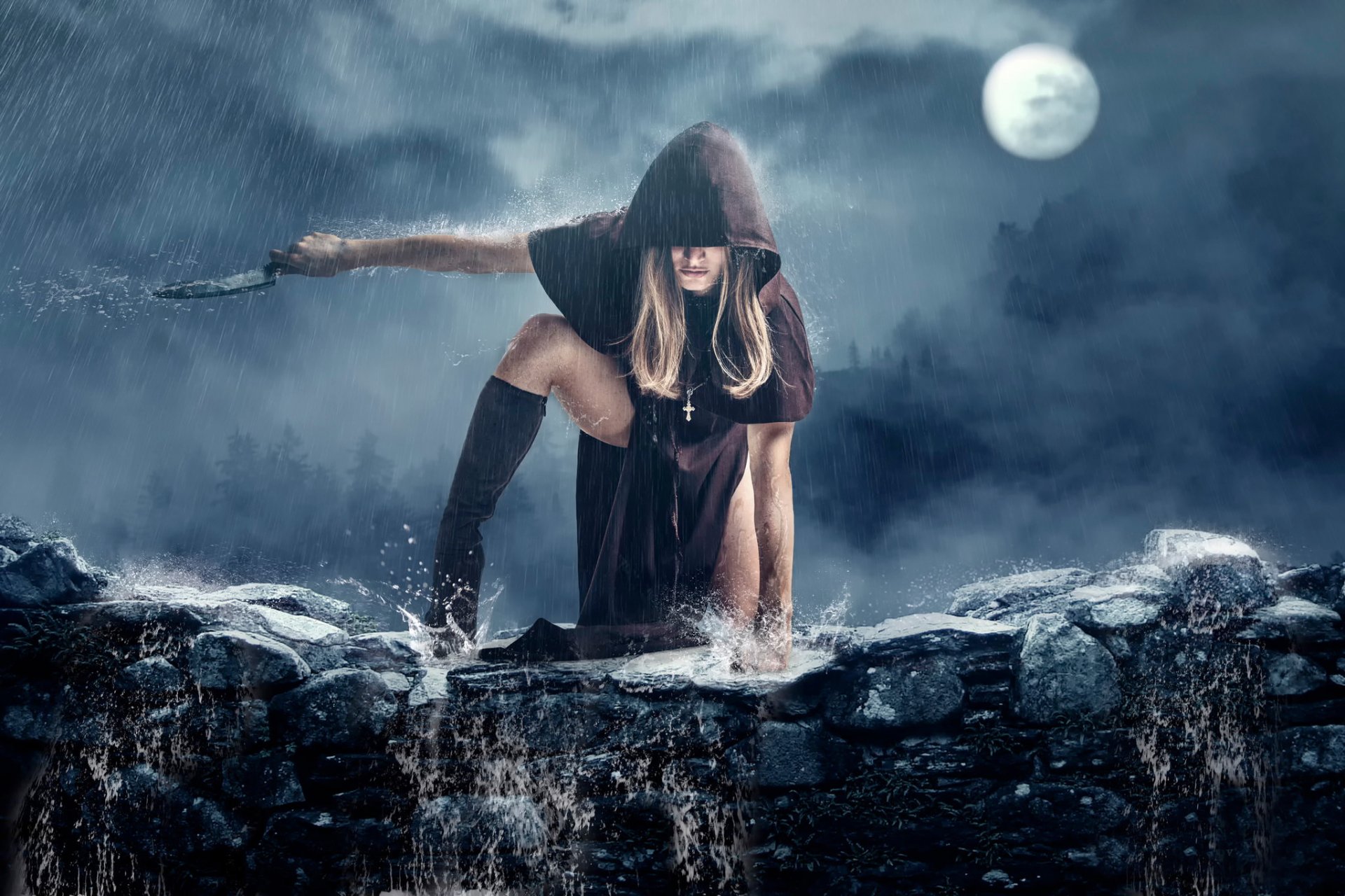 Ein mädchen im mantel tanzt mit einem messer unter dem mondEin Mädchen im Mantel tanzt mit einem Messer unter dem Mond
