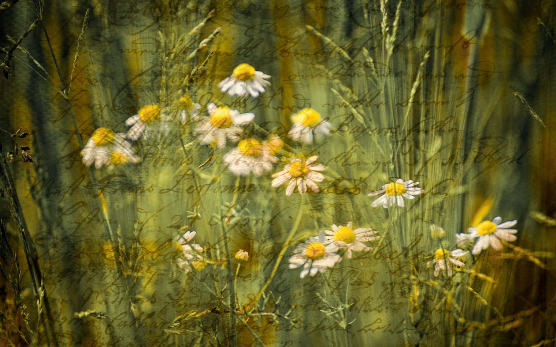 Ein brief, der in kalligrafischer handschrift auf einem gänseblümchenhintergrund geschrieben wurdeEin Brief, der in kalligrafischer Handschrift auf einem Gänseblümchenhintergrund geschrieben wurde