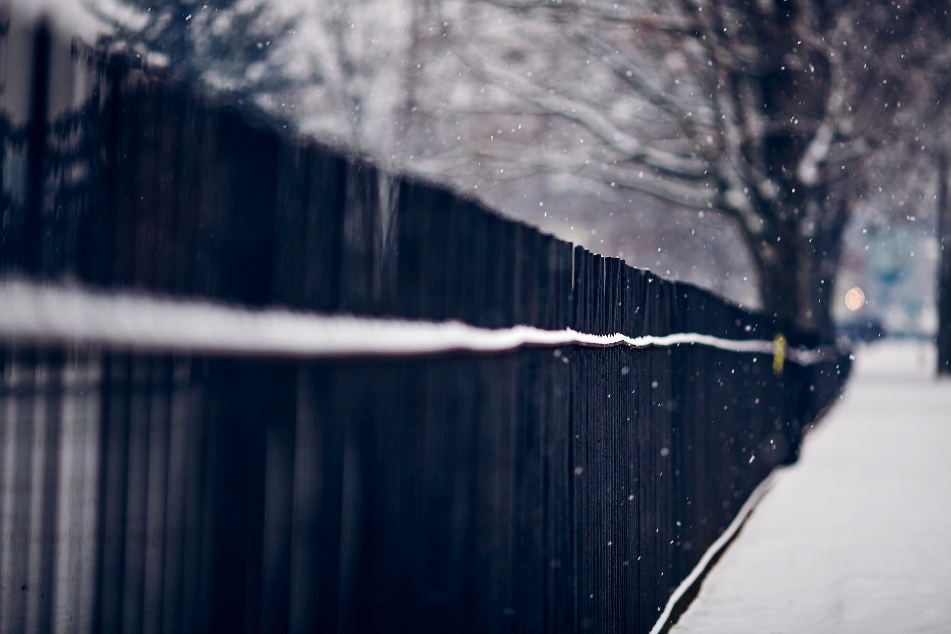 Langer schwarzer Zaun entlang einer verschneiten Straße