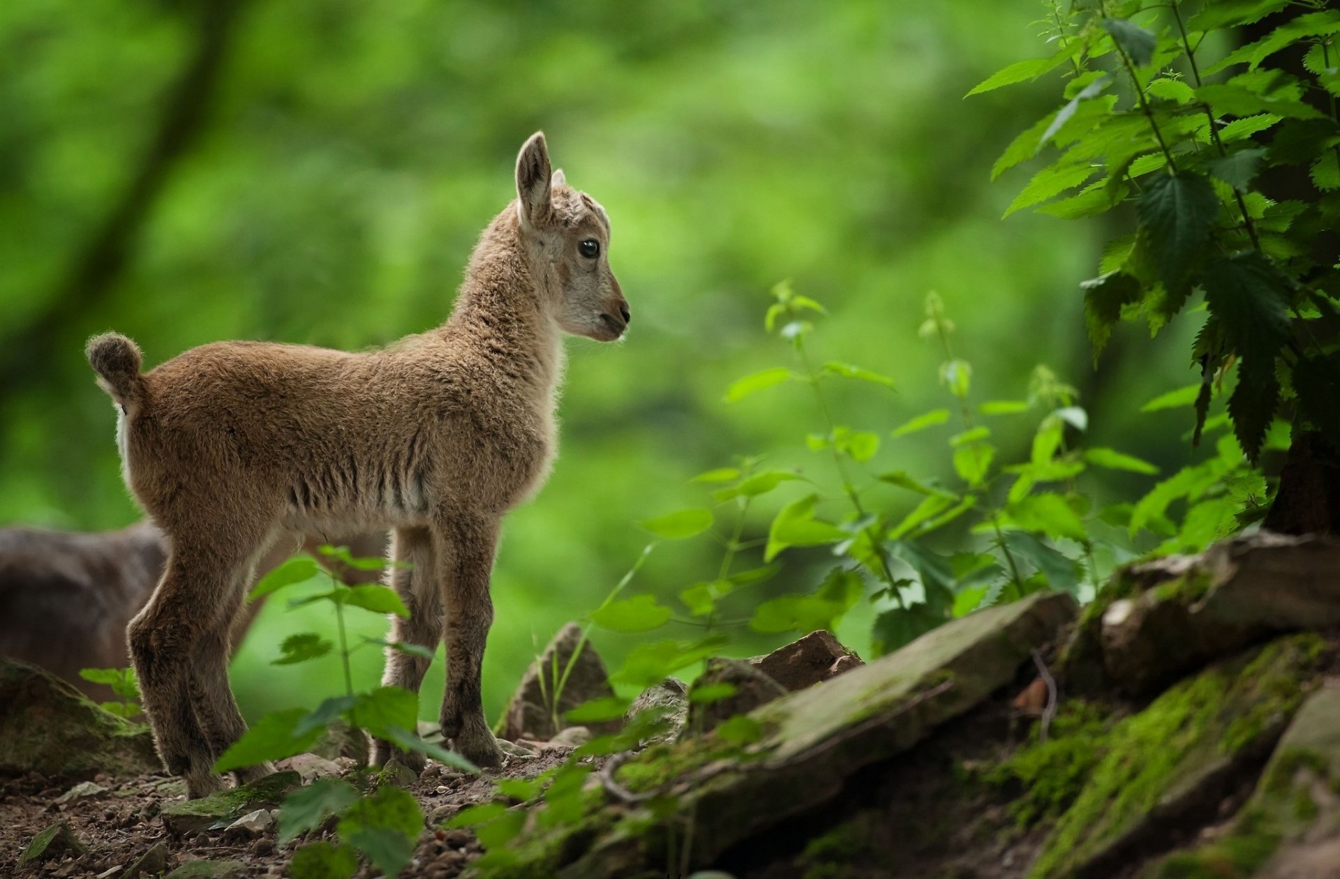 Kleine Ziege spaziert durch den grünen Wald