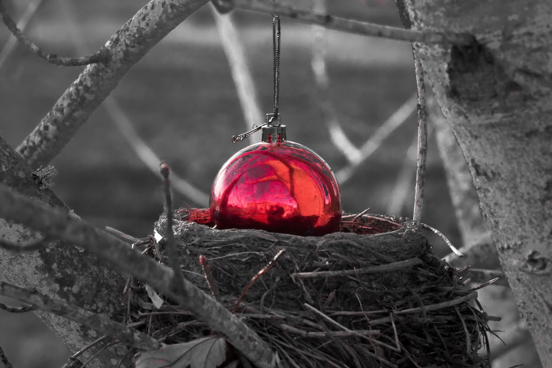 Leuchtend rotes Weihnachtsspielzeug im Nest