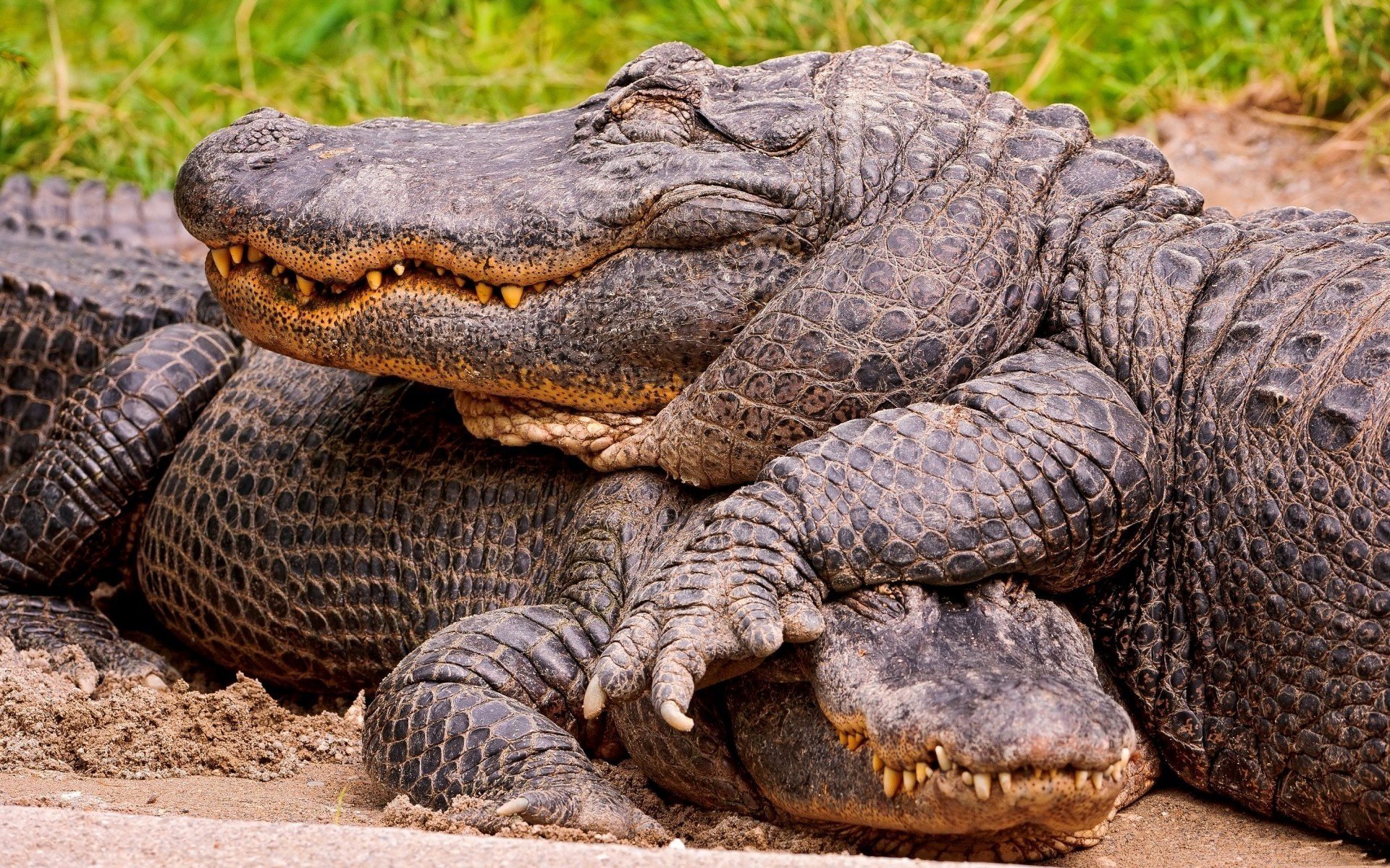 Zwei Krokodile wärmen sich im Sand