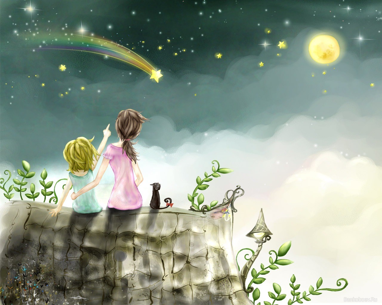 Zwei Mädchen schauen auf einen vorbeifliegenden Kometen