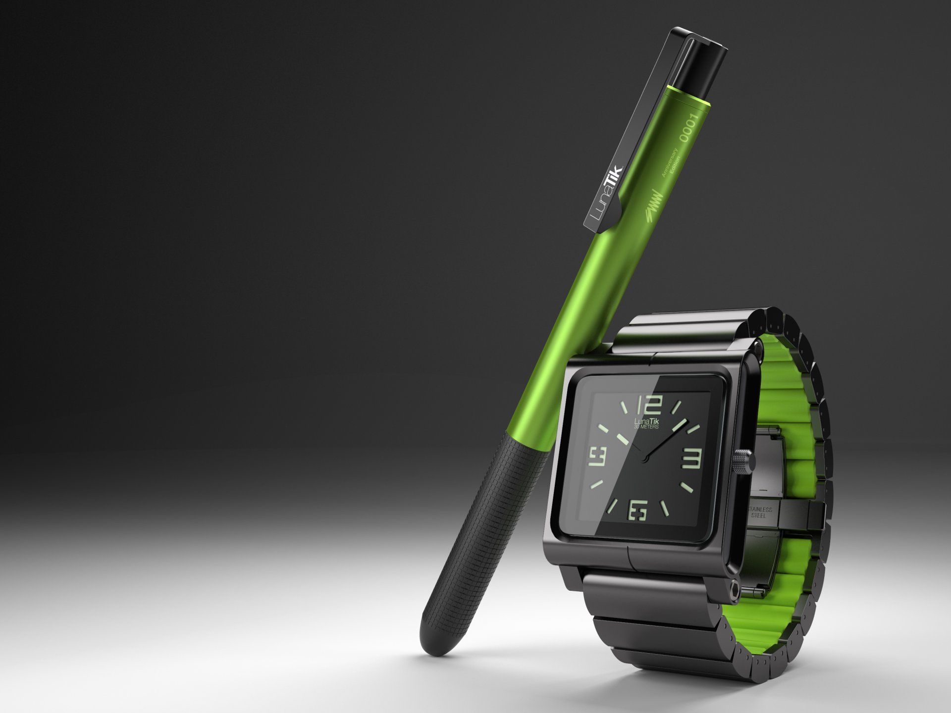 Schwarze Uhr und Stift mit grünem Einsatz - desktop-Hintergrund