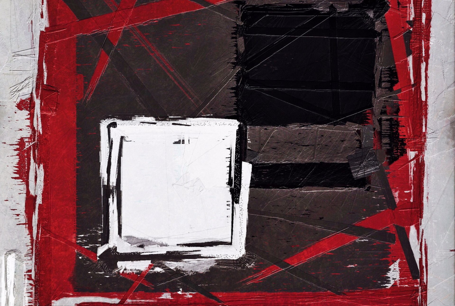 Abstrakte Leinwand mit weißen Quadraten in der Mitte auf schwarzem Hintergrund in rotem Rahmen - wallpaper für das Telefon