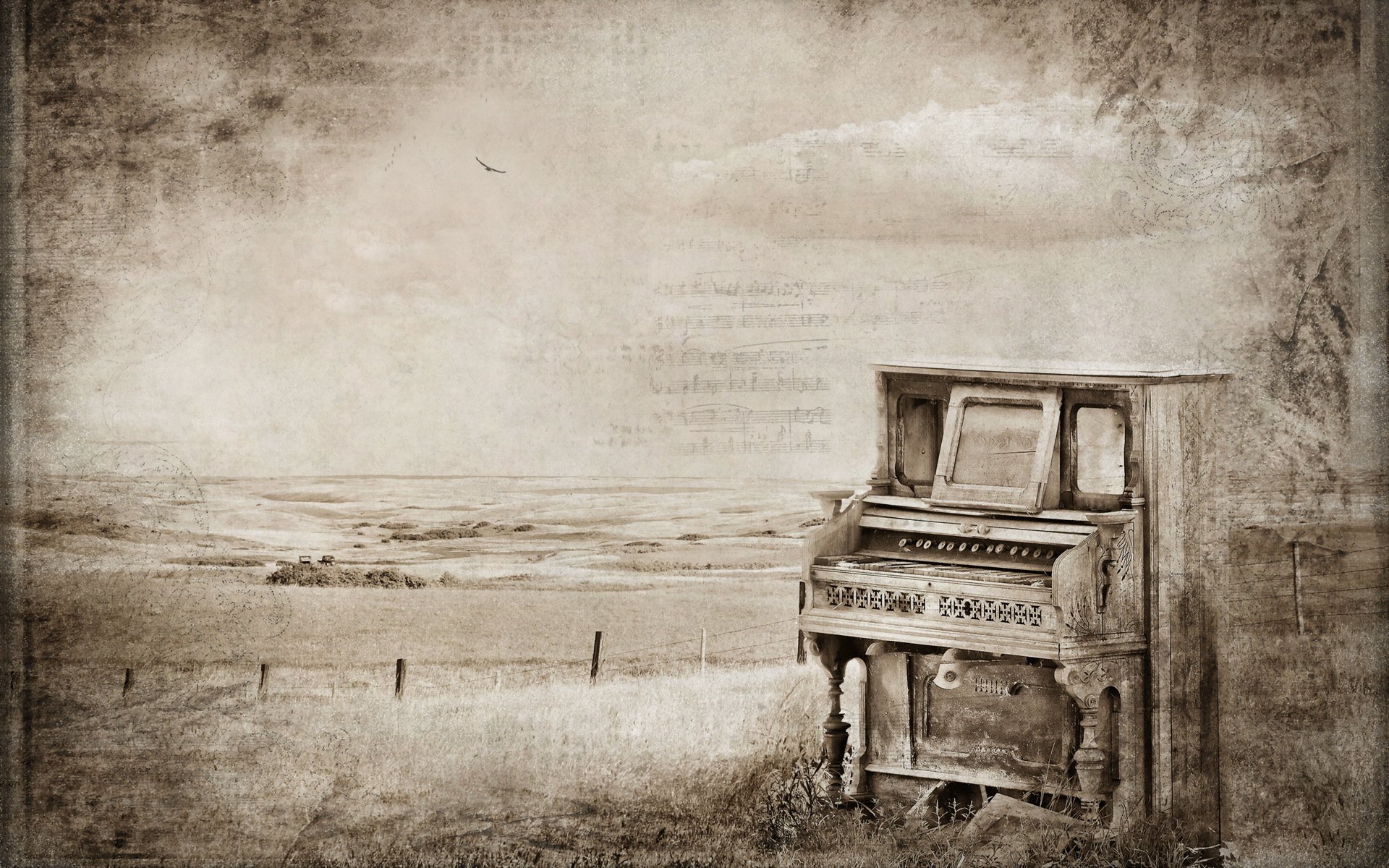 Schwarz-Weiß-Zeichnung eines alten Klaviers auf Naturhintergrund - wallpaper für das Telefon