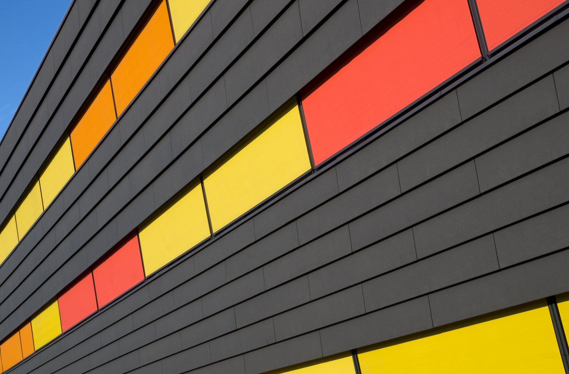 Schwarzes Plattenbaugebäude mit bunten Einsätzen - wallpaper für das Telefon