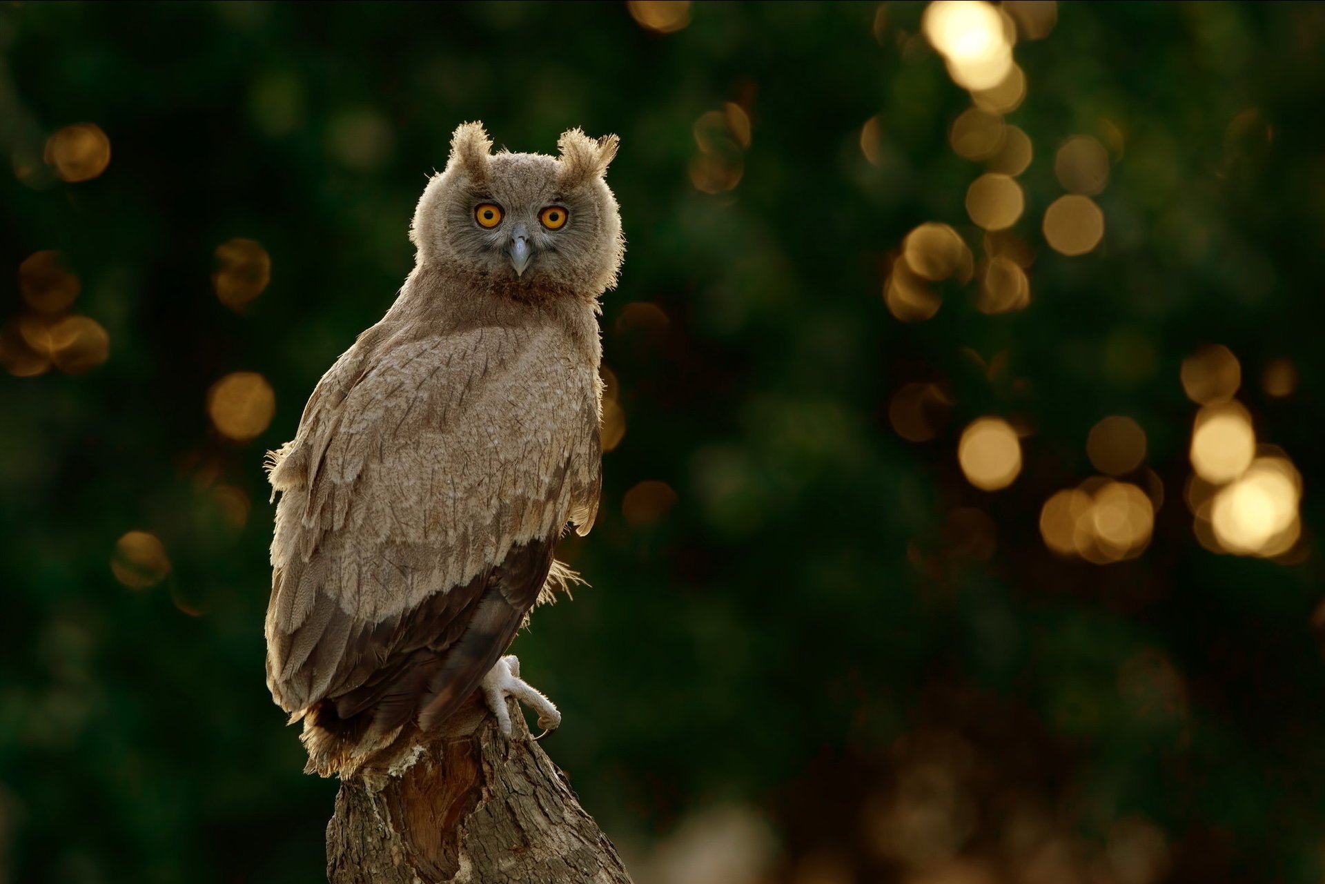 Eule auf verschwommenem Hintergrund mit gelben Lichtern - wallpaper für das Telefon