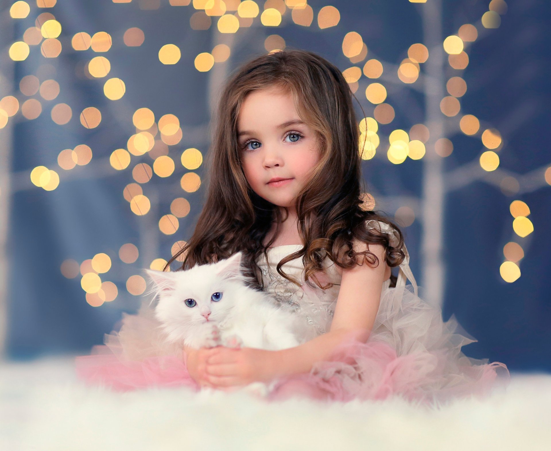 Foto von einem Mädchen mit einer weißen Katze - wallpaper für das Telefon