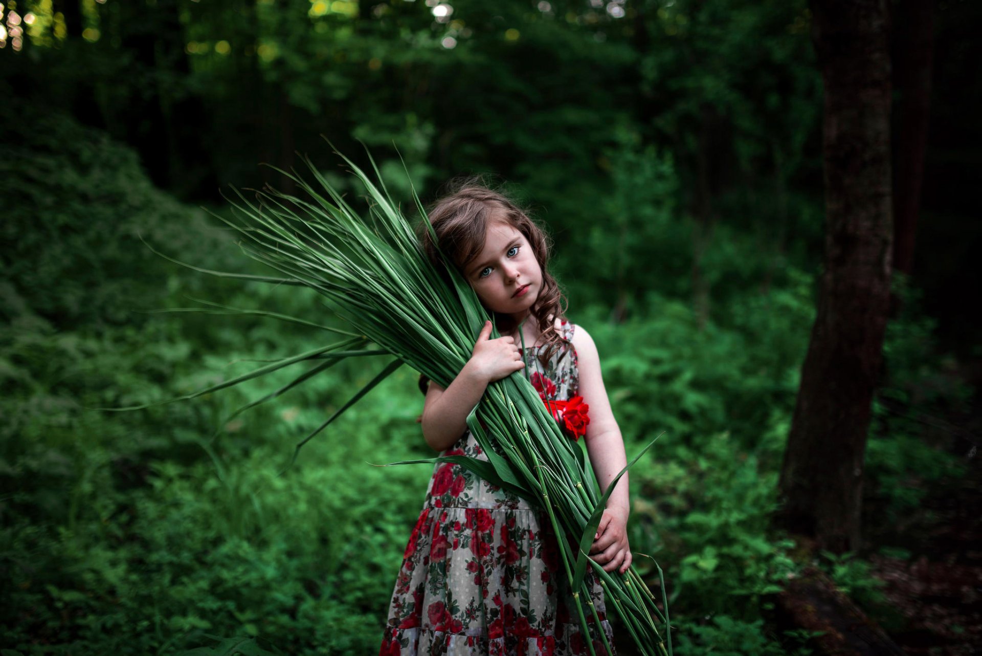 Mädchen im roten Sommerkleid im Wald - wallpaper für das Telefon
