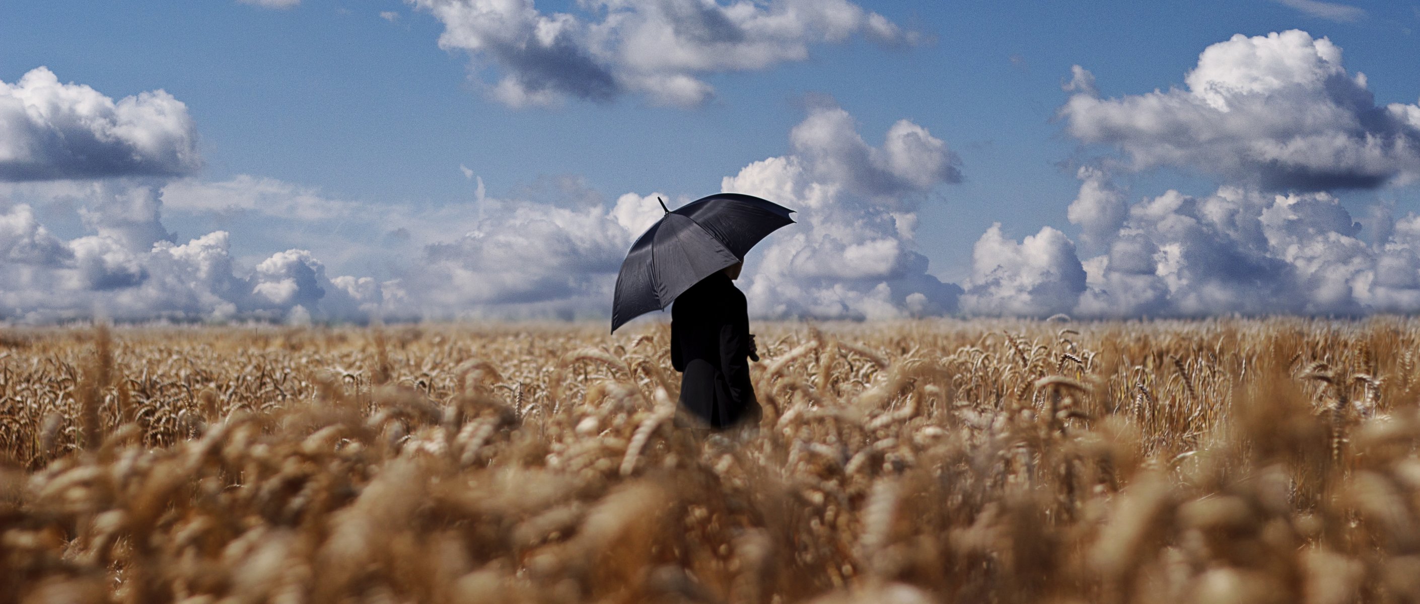 Auf einem weizenfeld ein mann mit einem schwarzen regenschirm